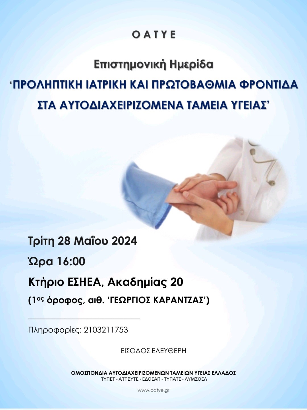 Πρόσκληση σε Επιστημονική Ημερίδα: ''ΠΡΟΛΗΠΤΙΚΗ ΙΑΤΡΙΚΗ ΚΑΙ ΠΡΩΤΟΒΑΘΜΙΑ ΦΡΟΝΤΙΔΑ ΣΤΑ ΑΥΤΟΔΙΑΧΕΙΡΙΖΟΜΕΝΑ ΤΑΜΕΙΑ ΥΓΕΙΑΣ''
